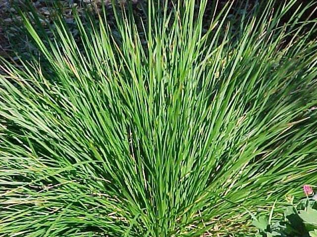 Flowers show case green, purple, silver, and gold tones over a dense, mounding clump of green blades.